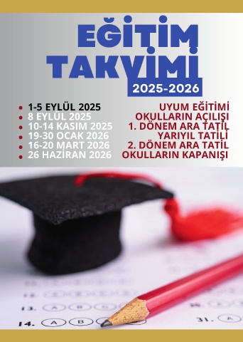 EĞİTİM TAKVİMİ 2025-2026 1-5 EYLÜL 2025 UYUM EĞİTİMİ 8 EYLÜL 2025 OKULLARIN AÇILIŞI 10-14 KASIM 2025 1. DÖNEM ARA TATİL 19-30 OCAK 2026 YARIYIL TATİLİ 16-20 MART 2026 2. DÖNEM ARA TATİL 26 HAZİRAN 2026 OKULLARIN KAPANIŞI