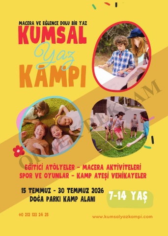 KAMPI KUMSAL VE EĞLENCE DOLU BİR YAZ MACERA Yaz ÖRNEK REKLAM EĞİTİCİ ATÖLYELER — MACERA AKTİVİTELERİ SPOR VE OYUNLAR — KAMP ATE Şİ VEHİKAYELER 15 TEMMUZ - 30 Temmuz 2026 7-14 yaş Doğa Parkı Kamp Alanı www.kumsalyazkampi.com +0 212 123 24 25